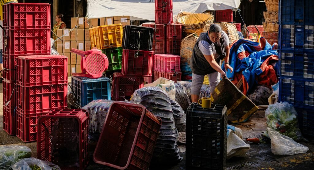 Onde usar caixas agrícolas na prática? Em escolas, empresas, condomínios, feiras, mercados e cooperativas de reciclagem.